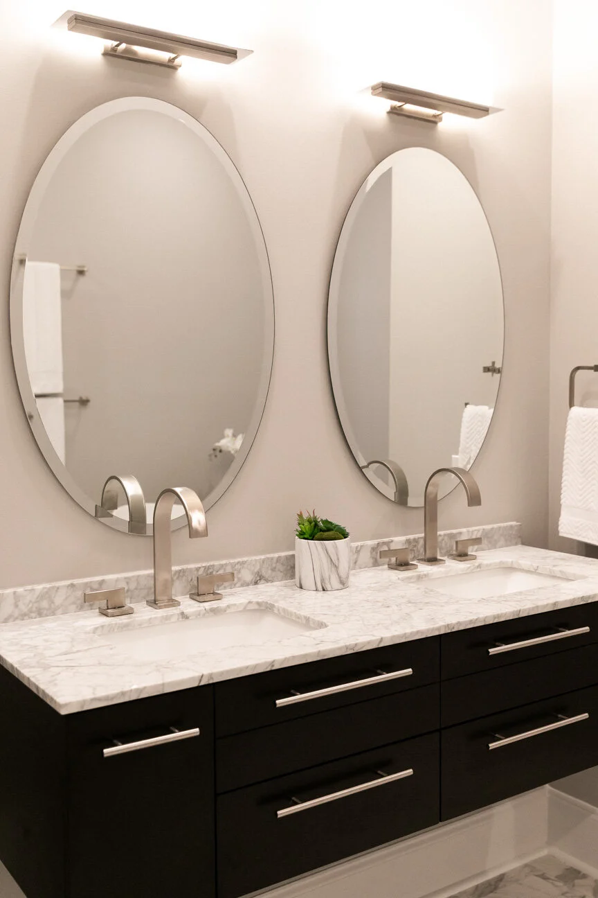 The owner wanted to update the 1998 master bathroom. A new layout was designed to provide space for the modern bathroom features the owner desired. A floating vanity, freestanding soaking tub and custom glass shower enclosure were pivotal for this bathroom renovation.