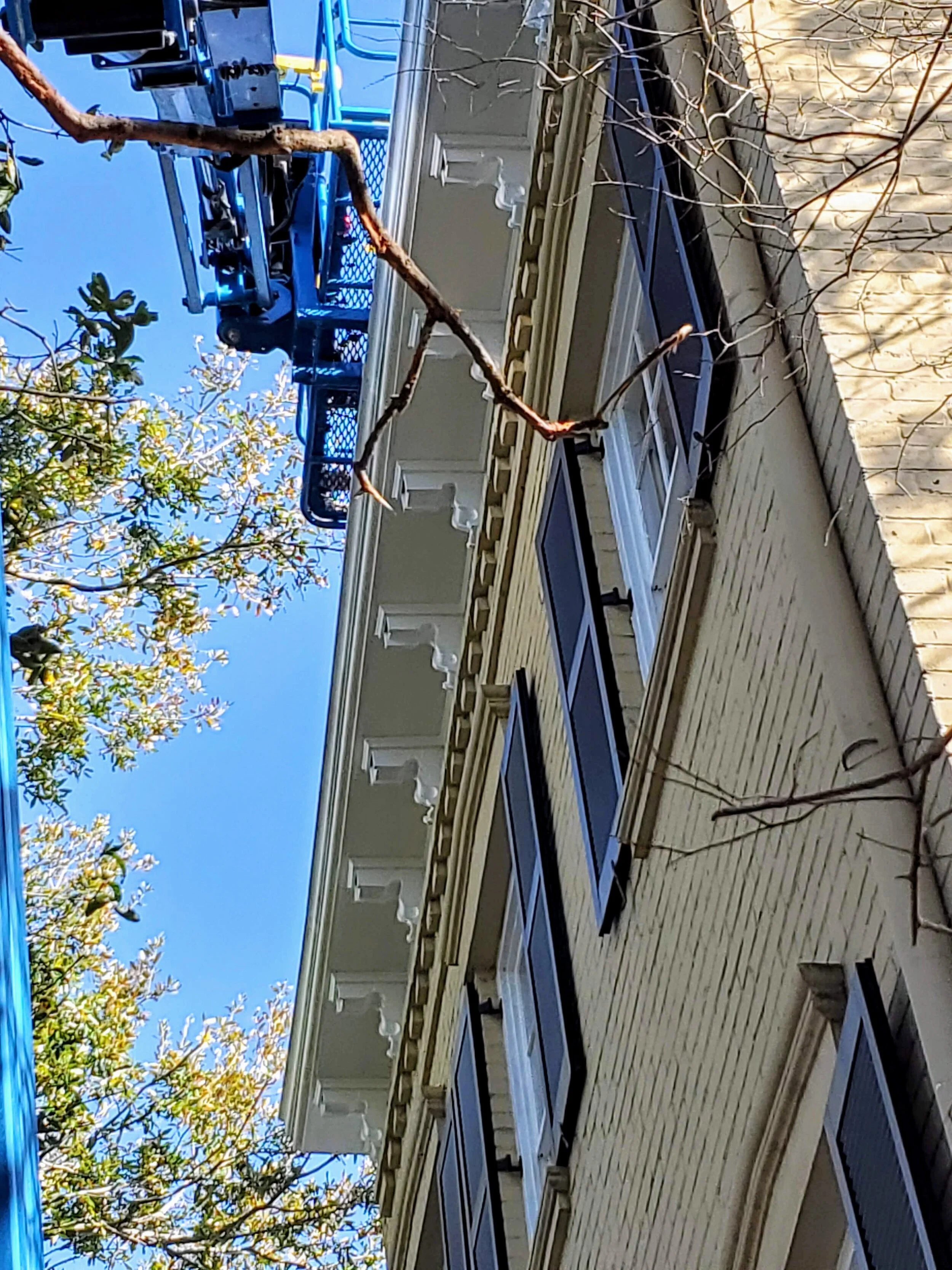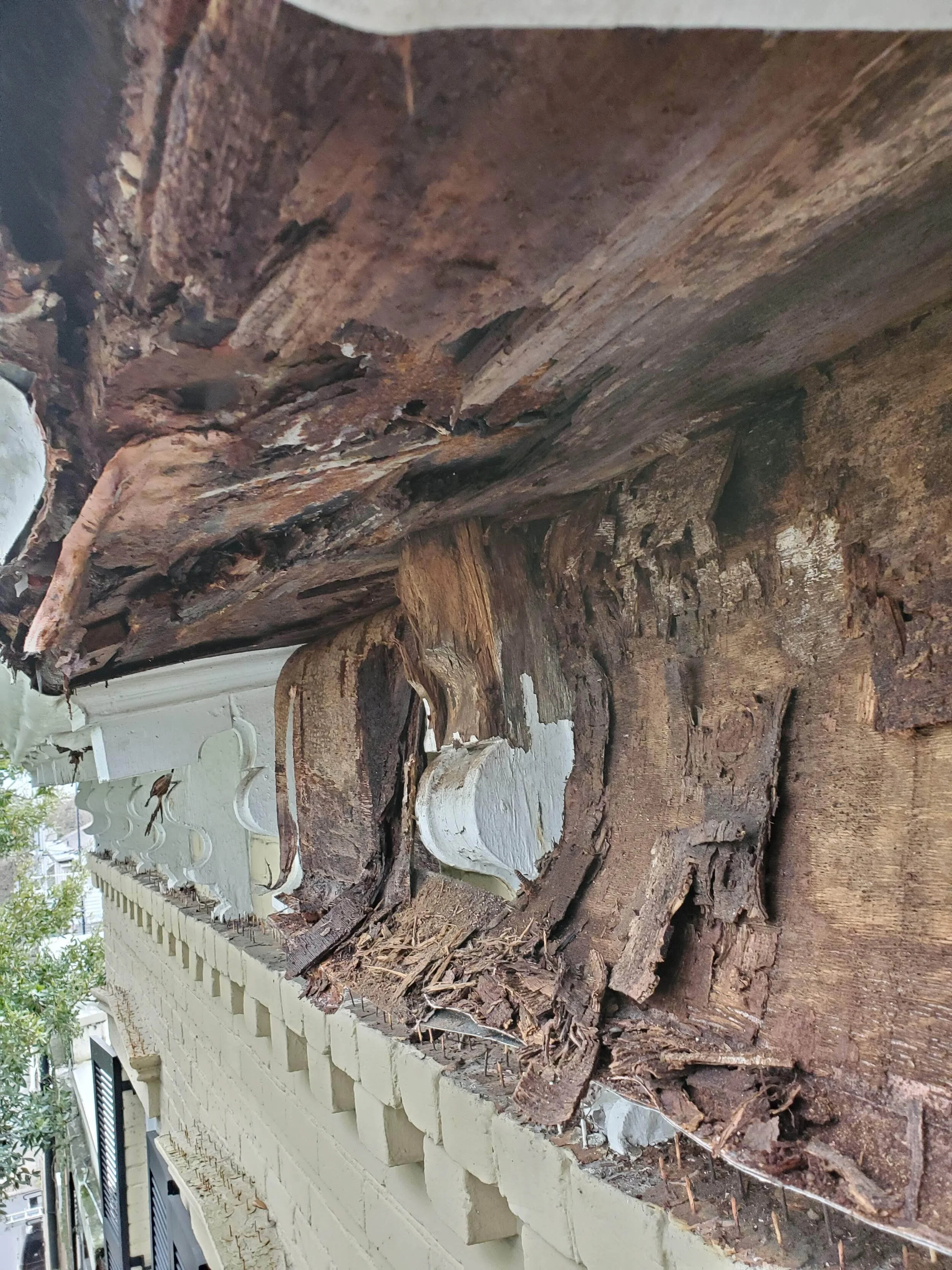 This home had a box gutter that was leaking and had rotted the façade of the house. The gutter was not built typically - it was built on a platform that rested on the corbels.
