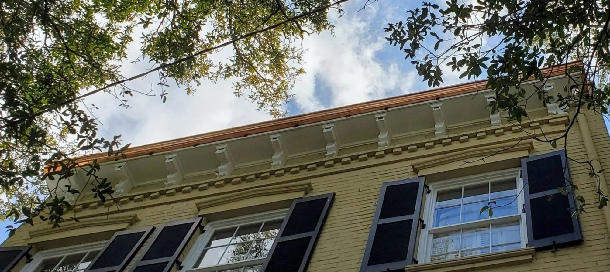 After fabricating a new solid copper gutter and extra trim to match the crown pattern, we finished everything up with fresh paint. Now the home is up-to-date and safe from hurricane winds, yet with the old-world craftsmanship intact!